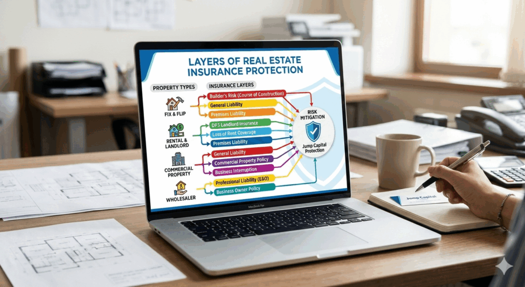 For Fix and Flip projects, Builder’s Risk (Course of Construction) is the gold standard, as standard homeowner policies often exclude properties undergoing significant renovation. If you have transitioned to Rental and Landlord holdings, a DP3 (Special Form) policy is non-negotiable; it covers the dwelling, provides premises liability for tenant injuries, and includes “Loss of Rent” coverage to keep your cash flow steady if the unit becomes uninhabitable. Commercial deals require even more robust General Liability and “Business Interruption” insurance to protect against massive operational halts that could otherwise bankrupt a growing portfolio.
